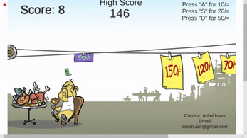 You need to pay each bill within the time bills get away. If the note you gave doesn't belong to the bill, it is game over for you! Fatso got only three types of note, 10/=, 20/= & 50/= . The bigger bills can shrink to smaller ones. But if you already have that note, it can not be shrunk. Like you can not shrink 50/= to 20+20+10, as fatso has already notes of it. The speed of the bills will gradually increase.